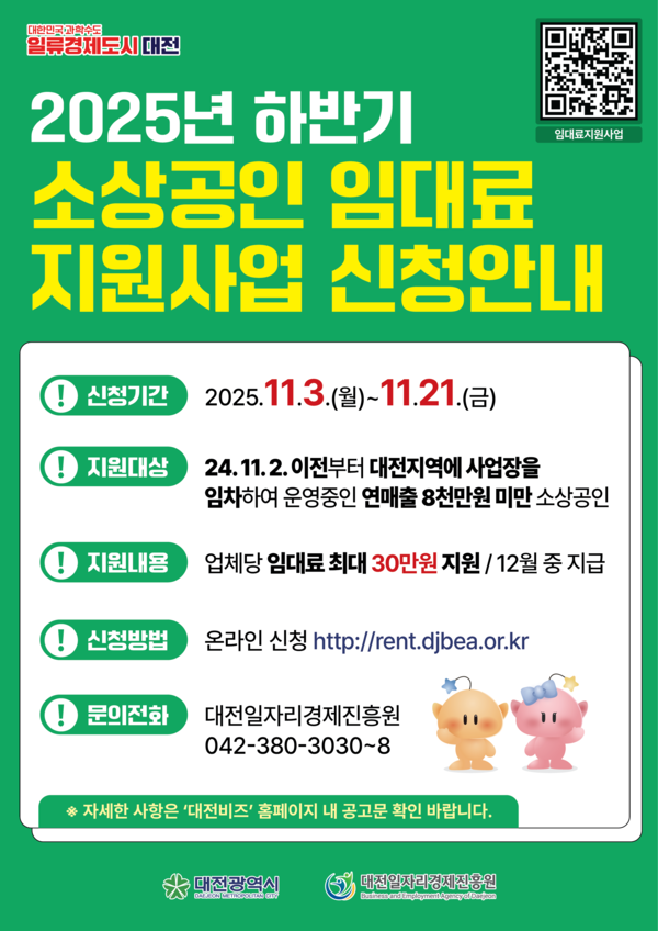 대전시가 소상공인의 경영 부담을 덜기 위해 하반기 임대료 지원사업으로 업체당 30만 원을 지원한다. 신청은 내달 3일부터 21일까지 대전시 중소기업지원 포털인 대전비즈(djbea.or.kr/biz)를 통해 하면 된다. 신청 대상은 공고일 기준 1년 이상 대전에서 사업장을 임차해 운영 중인 소상공인으로 연 매출액이 8000만 원 미만이어야 한다. 시는 제출 서류를 검토해 매출액이 적은 순으로 지원 대상을 선정할 계획이며 지원금은 12월 중 지급할 예정이다.