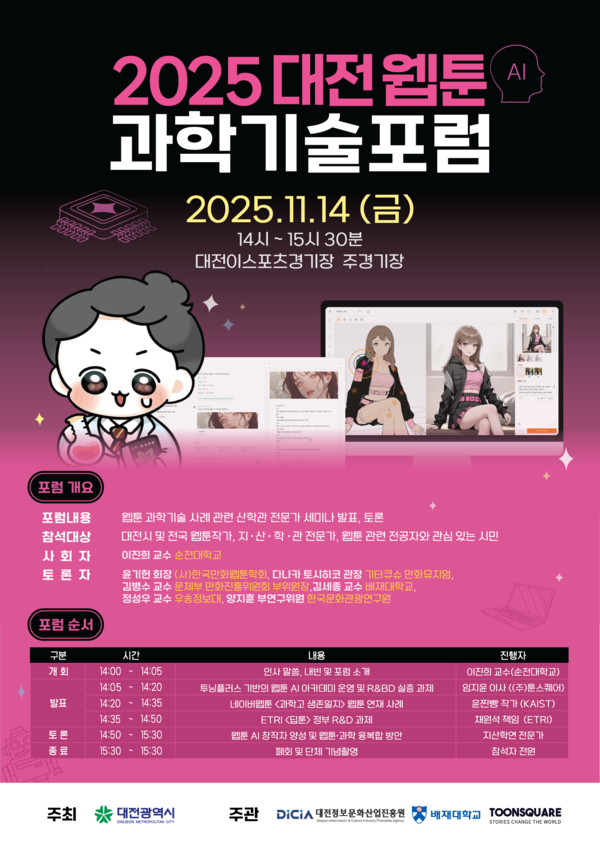 대전시와 대전정보문화산업진흥원이 내달 14일 대전이스포츠경기장에서 ‘웹툰 과학기술 포럼’을 개최한다. 포럼은 배재대학교와 ㈜툰스퀘어의 ‘투닝플러스 기반의 웹툰 AI 아카데미 운영 및 R&BD 실증과제’를발표를 시작으로 KAIST 윤찐빵 작가의 ‘네이버웹툰 과학고생존일지 연재사례’, 채원석 한국전자통신연구원 책임연구원의 ‘딥툰 정부 R&D 과제’특강 순으로 진행된다.