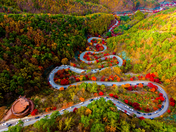 충북 단양군의 대표 단풍 명소 보발재가 형형색색 단풍으로 절정을 맞으며 전국 여행객들의 발길을 사로 잡고 있다.