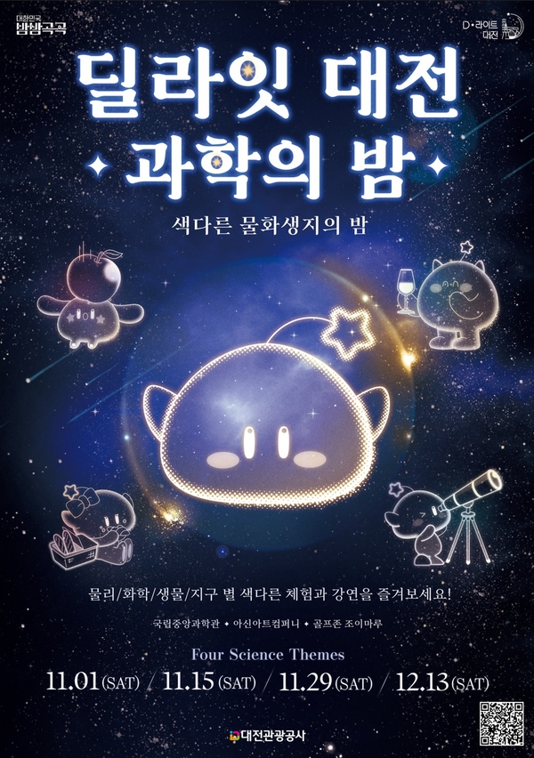 대전관광공사가 내달부터 12월까지 4회에 걸쳐 과학·문화·미식이 융합된 야간 프로그램인 딜라잇 대전 과학의 밤 참가자를 모집한다. 프로그램은 물리·화학·생물·지구과학 등 기초과학을 대전의 대표 브랜드인 빵과 와인에 접목해 시민이 과학을 보다 쉽고 흥미롭게 체험할 수 있도록 기획됐다. 참가 신청은 포스터 내 QR코드를 통해 가능하며 선착순으로 마감된다.