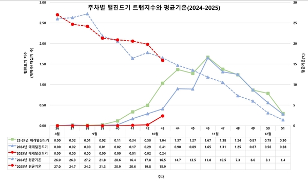 30일 질병관리청에 따르면 이번 주(43주차) 쯔쯔가무시증을 매개하는 털진드기 지수는 0.24로 지난주 0.02 대비 12배 급증했다. 털진드기 지수는 털진드기 채집 개체 수를 포획에 사용한 트랩 수로 나눈 값이다.