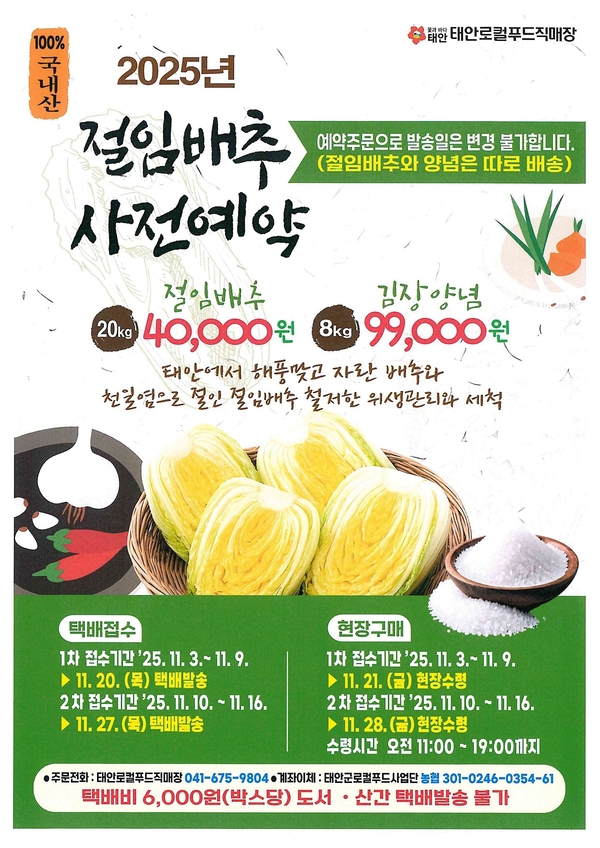 오는 9일 1차 주문이 마감돼 20일 일괄 택배 발송되며, 2차 주문은 16일 마감해 27일 발송된다. 직접 수령을 원하는 구매자는 사전 예약 후 21일(1차 접수자)과 28일(2차 접수자) 태안로컬푸드직매장(남면 안면대로 1641)을 방문하면 된다. 수령시간은 오전 11시부터 오후 7시까지다.