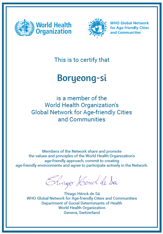 보령시는 지난 8월 WHO에 가입 신청서를 제출한 후, 고령친화도시 조성계획의 체계성, 시민 참여도, 고령자 친화적 정책 추진성과 등을 종합적으로 검토받아 최종 인증을 획득했다.
