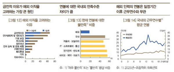 국내 체류 연구자들이 해외 이직을 고려하는 가장 큰 이유는 금전적 요인(66.7%, 1∼3순위 복수응답)이다. 국내 이공계 인력의 절반 이상은 연봉 수준에 대해 ‘불만족’ 또는 ‘매우 불만족’이라고 응답한 반면, 해외 인력은 이 비중이 20% 미만에 그쳤다. 분야별로는 바이오·제약·의료기기, 전기전자·반도체, IT·소프트웨어·통신 순으로 불만족 비중이 높다. 특히 전기전자·반도체와 자동차·모빌리티 분야는 국내 평균 연봉이 높은 편임에도 석·박사급 인력들은 기업 성과에 비해 보상이 충분하지 않다고 인식하고 있다. 근무연수별 평균 연봉 추이를 보면 국내 이공계 인력의 평균 연봉은 근무연수에 따라 완만하게 상승하는 반면, 해외 인력의 평균 연봉은 경력 초반 급격히 증가한 뒤 근무연수와의 상관관계가 사라진다. 해외 체류 연구자의 경우 13년차에 36만 6000달러로 최고점이 찍히지만 국내 연구자의 경우 19년차에 12만 7000달러로 정점을 찍고 하락한다. 절대적인 연봉 차이가 나타날 뿐만 아니라 근무연수에 비례하는 보상구조와 초기 경력 기회의 격차가 젊은층의 해외 근무 선호를 높이는 주요인으로 작용하는 것으로 보인다고 한은은 분석했다.