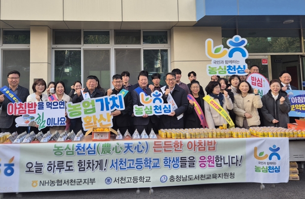 농협 서천군지부(지부장 조성배)와 서천고등학교(교장 강용중)는 4일 아침 등굣길에 서천고등학교에서 아침식사의 중요성을 알리기 위해 농심천심(農心天心)운동이 일환으로 아침밥먹기 행사를 실시했다.