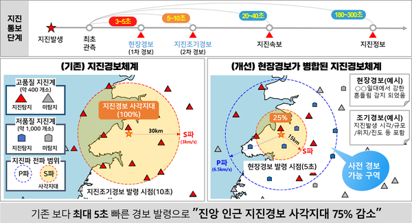 아울러 정부는 피해 가능성이 있는 진앙 인근 지역에 최대 5초 더 빠른 지진조기경보 체계를 구축한다. 현재 지진조기경보는 지진 관측 후 통보까지 5~10초가 소요되는데 원자력, 철도 등과 관련한 36개 국가 주요시설에 시범운영 중인 지진현장경보를 기존 지진조기경보와 병합한 새로운 조기경보체계를 내년부터 운용해 발령시간을 3∼5초 수준으로 낮춤으로써 흔들림을 먼저 느낀 후 경보를 받는 지진경보 사각지대를 대폭 해소할 계획이다.