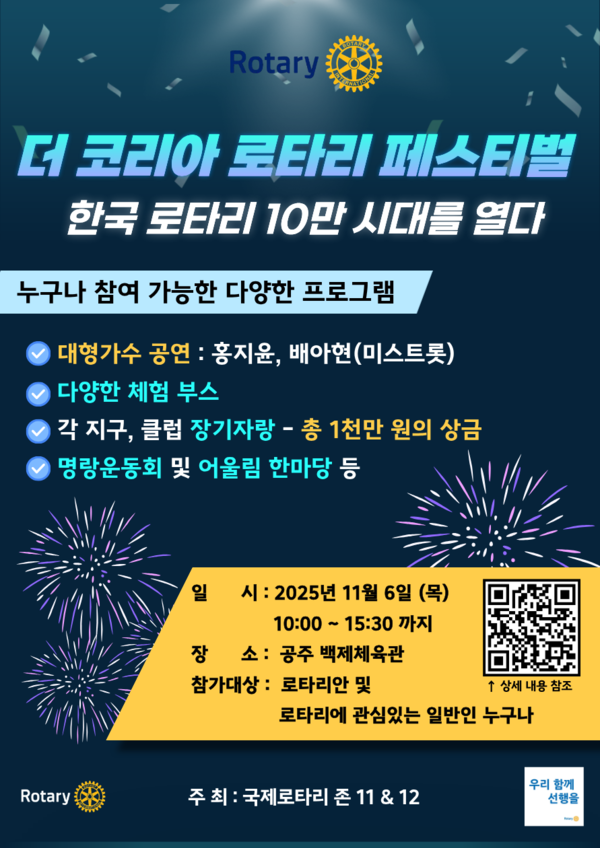 행사는 아레조 회장과 장애인 단체, 지구별 깃발과 배너가 입장하는 퍼레이드를 시작으로 명랑운동회, O·X 퀴즈, 장기자랑, 로타리 감동 이야기 발표 등 다채로운 프로그램이 마련된다. 오후에는 가수 홍지윤, 선율, 배아현, 라클라쎄 등이 출연하는 ‘나눔 콘서트’가 열려 축제 분위기를 뜨겁게 달굴 예정이다.