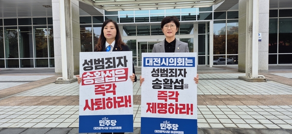 김민숙 대전시의원(더불어민주당·비례)과 신혜영 민주당 대전시당 여성위원장이 송활섭 의원(무소속·대덕구2) 사퇴를 촉구했다.