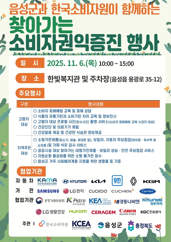 충북 음성군은 6일 한빛복지관에서 한국소비자원과 함께 ‘찾아가는 소비자 권익증진 행사’를 개최했다.
