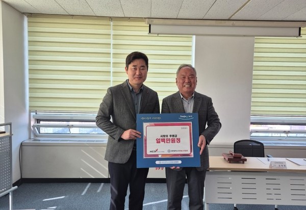 지난 5일 한국건강관리협회 대전충남지부(본부장 장국진)가 대전시자원봉사연합회를 찾아 지역사회 소외계층의 따뜻한 겨울나기를 지원하기 위해 후원금 100만 원을 전달하고 있다. 후원금은 12일 엑스포남문광장에서 진행될 제17차 따뜻한 겨울나기 김장 대봉사에 쓰일 예정이다. 한국건강관리협회 대전충남지부 제공