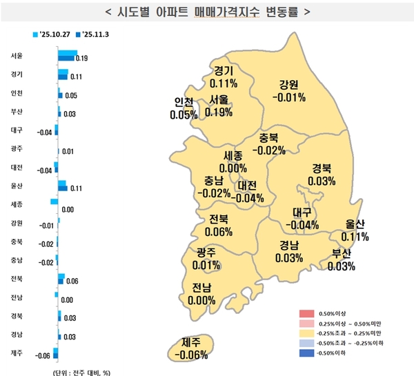 6일 한국부동산원이 발표한 11월 첫째 주(11월3일 기준) 주간 아파트 가격 동향에 따르면 전국 주간 아파트 매매가격은 지난주(0.07%) 대비 상승했다. 지역별로는 수도권(0.14%→0.13%) 및 서울(0.23%→0.19%)은 상승폭이 줄었고 지방(0.00%→0.01%)은 상승 전환됐다. 지방의 상승 전환은 2023년 11월 이후 100주 만이다.