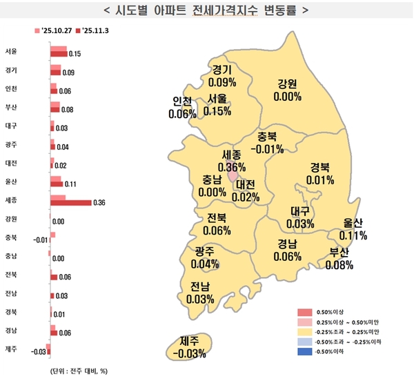 반면 충청권 아파트 전세가격은 큰 폭은 아니지만 일단 상승모드다. 특히 세종이 0.36%를 기록하면서 전국에서 가장 큰 폭으로 상승했다. 다정·종촌동 정주여건 양호한 단지 위주로 상승했다는 게 부동산원의 설명이다.