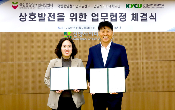 건양사이버대학교와 국립중앙청소년디딤센터는 지난 7일 오전 11시 대학 어니스티홀에서 업무협약을 체결하고 청소년 복지 및 교육 지원을 위한 협력 체계를 구축했다.
