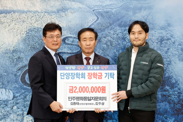 충북 단양군은 민주평화통일자문회의 단양군협의회 김종태 회장과 아들 김주상 씨가 지역 인재 양성을 위해 장학금 200만 원을 단양장학회에 기탁했다 10일 밝혔다.