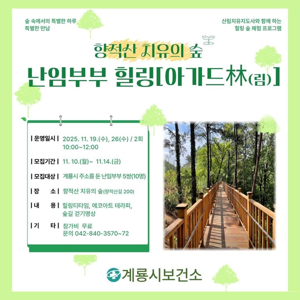 계룡시는 난임으로 어려움을 겪는 부부의 정서적 부담을 덜고 심리 회복을 돕기 위해 난임부부 힐링 프로그램 ‘아가드림(林)’을 오는 19일과 26일 총 2회 운영한다.