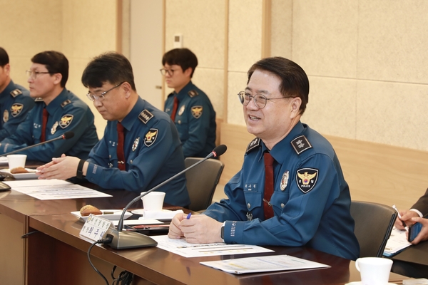 최주원 대전경찰청장(오른쪽)이 11일 대전대덕경찰서를 방문해 치안 현황을 보고 받고 있다. 최 청장은 이날 현장 의견을 청취하며 주민 체감 안전 강화를 당부했다.