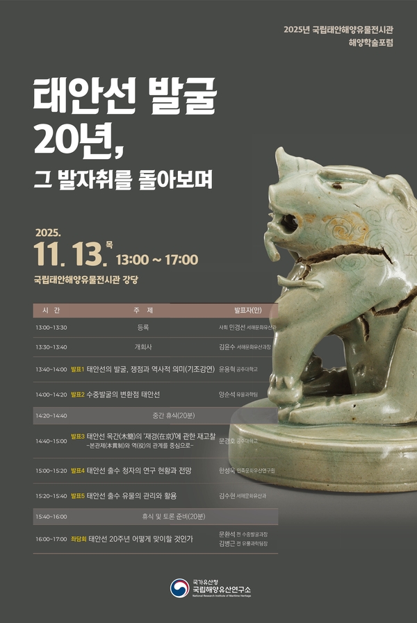 국유산청 국립해양유산연구소는 13일 오후 1시 국립태안해양유물전시관에서 ‘태안선 발굴 20년, 그 발자취를 돌아보며’를 주제로 한 2025년 국립태안해양유물전시관 해양학술포럼을 연다. 이 자리에선 우리나라 해양유산 연구의 새 지평을 연 태안선 수중발굴 20주년(2027년)을 맞아 국립해양유산연구소가 추진 예정인 기념사업 관련 아이디어와 실행 방향을 논의한다.