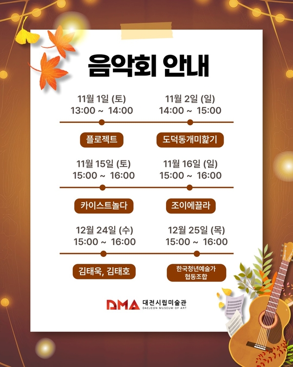 대전시립미술관은 11월과 12월, 미술관을 찾는 시민들에게 예술과 음악이 어우러진 특별한 시간을 선사하기 위해 ‘DMA 음악회’를 개최한다.