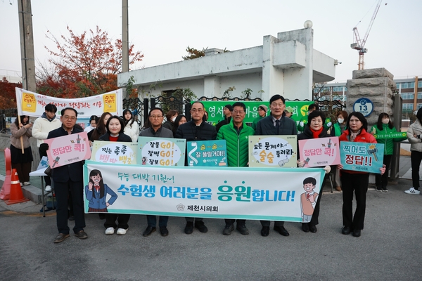 충북 제천시의회는 13일 오전, 2026학년도 대학수학능력시험을 치르는 지역 수험생들을 응원하기 위해 제천여자고등학교, 제천제일고등학교, 제천고등학교 등 관내 3개 시험장을 차례로 방문했다.