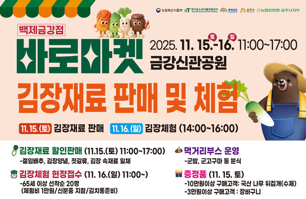 시는 본격적인 김장철을 맞아 지역 농산물 소비를 촉진하고 시민들에게 체험 기회를 제공하기 위해 ‘바로마켓 김장 재료 판매 및 체험 행사’를 오는 15일과 16일 이틀간 공주 금강신관공원에서 개최한다.