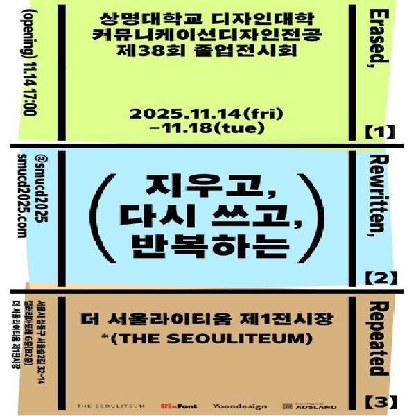 상명대학교(총장 김종희) 디자인대학 커뮤니케이션디자인전공은 14일~18일까지 5일간 더 서울 라이티움 제1전시장(서울시 성수동 소재)에서 제38회 졸업작품전 'Erased, Rewritten, Repeated'을 개최한다.