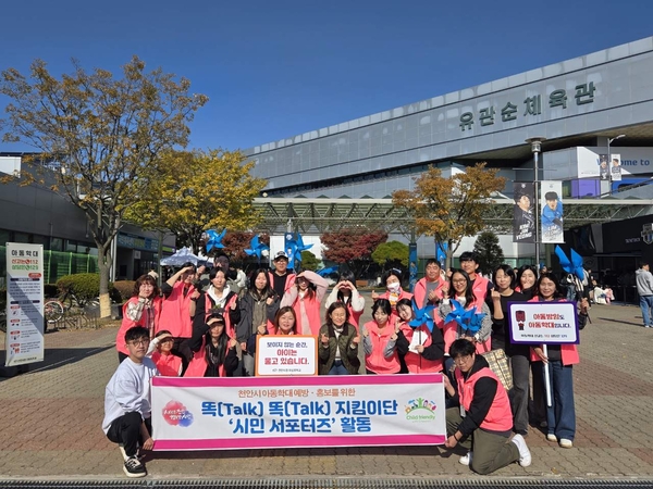 천안시는 지난 16일 ‘똑(Talk)똑(Talk)지킴이단’ 시민서포터즈가 아동학대 예방주간을 맞아 아동학대 예방·홍보 캠페인을 실시했다고 밝혔다.