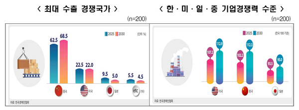 한국의 기업경쟁력을 100으로 가정했을 때 미·일·중의 기업경쟁력 수준에 대해선 2025년 현재에는 미국 107.2, 중국 102.2, 일본 93.5 수준인데 2030년엔 미국 112.9, 중국 112.3, 일본 95.0로 전망했다. 국내 기업들은 우리나라 기업경쟁력이 이미 미국과 중국에 뒤처지고 있고 5년 뒤엔 그 격차가 더욱 벌어질 것으로 판단하고 있으며 특히, 5년 뒤 중국의 기업경쟁력은 미국과 대등한 수준으로 발전할 것으로 내다보고 있다고 한경협은 분석했다.