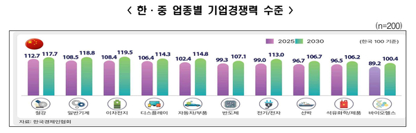 한국의 업종별 기업경쟁력을 100으로 보고 중국과의 업종별 기업경쟁력을 비교해보면 2025년 현재 중국은 철강(112.7), 일반기계(108.5), 이차전지(108.4), 디스플레이(106.4), 자동차·부품(102.4) 등 5개 업종에서 한국보다 경쟁력이 높은 것으로 나타났다. 반면 반도체(99.3), 전기·전자(99), 선박(96.7), 석유화학·석유제품(96.5), 바이오헬스(89.2) 등 5개 업종은 한국의 경쟁력이 아직은 높은 것으로 조사됐다. 5년 뒤인 2030년엔 10개 주력업종 모든 분야에서 중국의 경쟁력이 한국보다 높아질 것으로 응답 기업들은 전망했다.