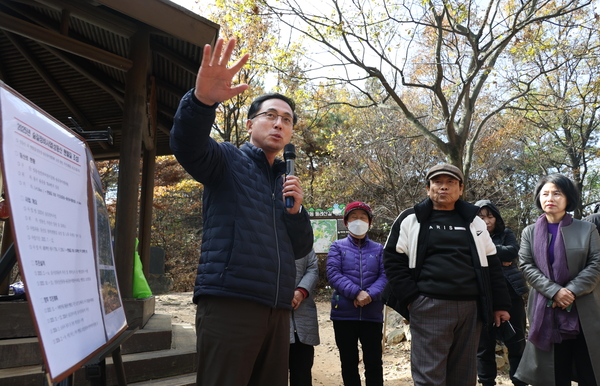 박희조 대전 동구청장(왼쪽)이 17일 동구민과 성동산맨발길을 살피고 있다. 박 청장은 등산로 중 400m 구간에 설치된 흙길과 보행매트를 직접 걸으며 구민으로부터 생활 불편 사항과 건의사항을 청취했다.