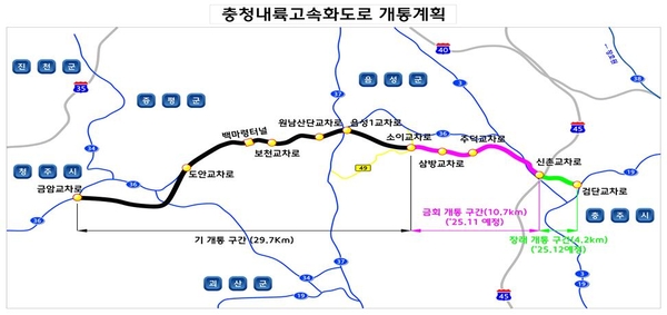 특히, 올해 12월에 3공구 충주 대소원면 신촌교차로에서 중앙탑면 검단교차로까지 4.2㎞구간과 4공구 충주 금가면에서 제천 봉양읍까지 13.2㎞ 구간을 개통하면 충청내륙고속화도로는 2011년 실시설계를 끝내고 2017년 첫 삽을 뜬 이후 15년 만에 완전 개통을 하게 된 것이다.