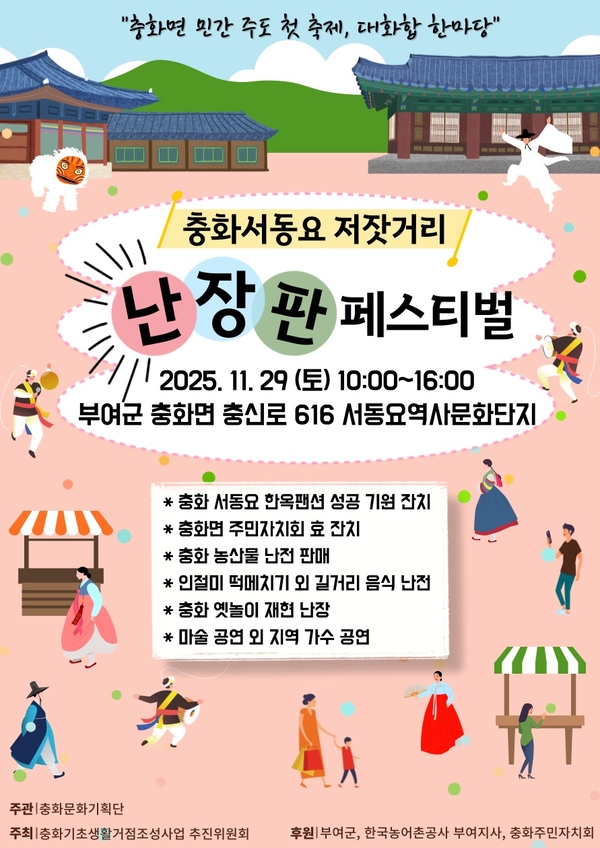 이러한 고정 관념을 불식시키고 충화면을 도약의 발판에 올려놓기 위해 이달 29일 충화면 서동요역사관광단지에서 주민 주도형 첫 축제인 ‘충화 서동요 저잣거리 난장판 페스티벌’이 열린다.