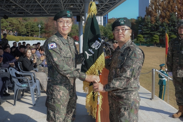 18일 열린 육군군수사령부 제41·42대 사령관 이·취임식에서 김규하 육군참모총장(왼쪽)이 박춘식 신임 육군군수사령관에게 부대기를 전달하고 있다. 박 신임 사령관은 육군사관학교 49기로 임관해 제7공수특전여단장, 육군본부 군수기획차장, 제28보병사단장 등을 거쳤으며 취임 전까지 군수사령부 참모장으로 근무했다.