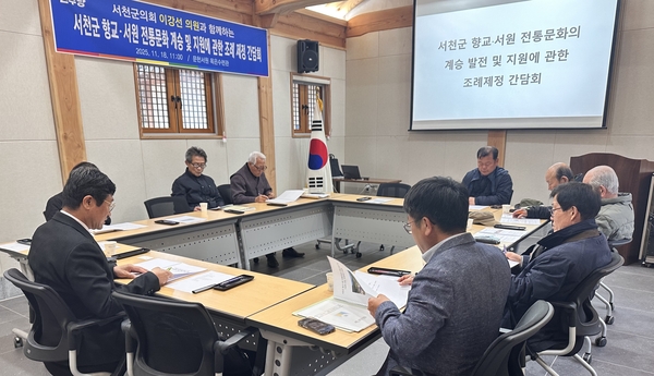 서천군의회 이강선 의원은 지난 18일 문헌서원 목은수련관에서 관내 향교·서원 관계자들과 간담회를 갖고 전통문화의 체계적인 계승과 지원을 위한 조례 제정에 나섰다.