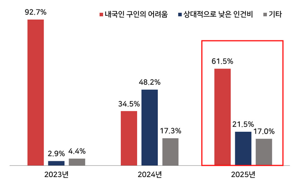 외국인 근로자를 고용하는 가장 큰 이유는 내국인 구인이 어려워서다. 61.5%가 이렇게 답했다. 상대적으로 낮은 인건비(21.5%) 역시 외국인 근로자 고용의 주된 이유로 작용하고 있다. 지난해 조사에선 내국인 구인 어려움이 34.5%, 낮은 인건비를 꼽은 비율이 48.2%였다. 우리 기업의 외국인 근로자 활용 목적이 단순 비용 절감보단 일손이 부족해 외국인을 고용해야 하는 현실적 수요 측면이 강화됐다는 의미라고 경총은 해석했다. 2023년엔 내국인 구인 어려움을 꼽은 비율이 92.7%였다.
