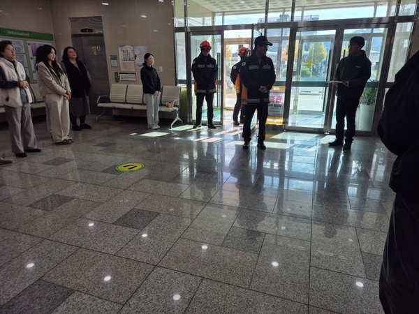 훈련 종료 후에는 자체 소방교육도 이어져 자위소방대원의 임무를 숙지하고 소화기를 이용한 초기 진화 방법 등을 배웠다.