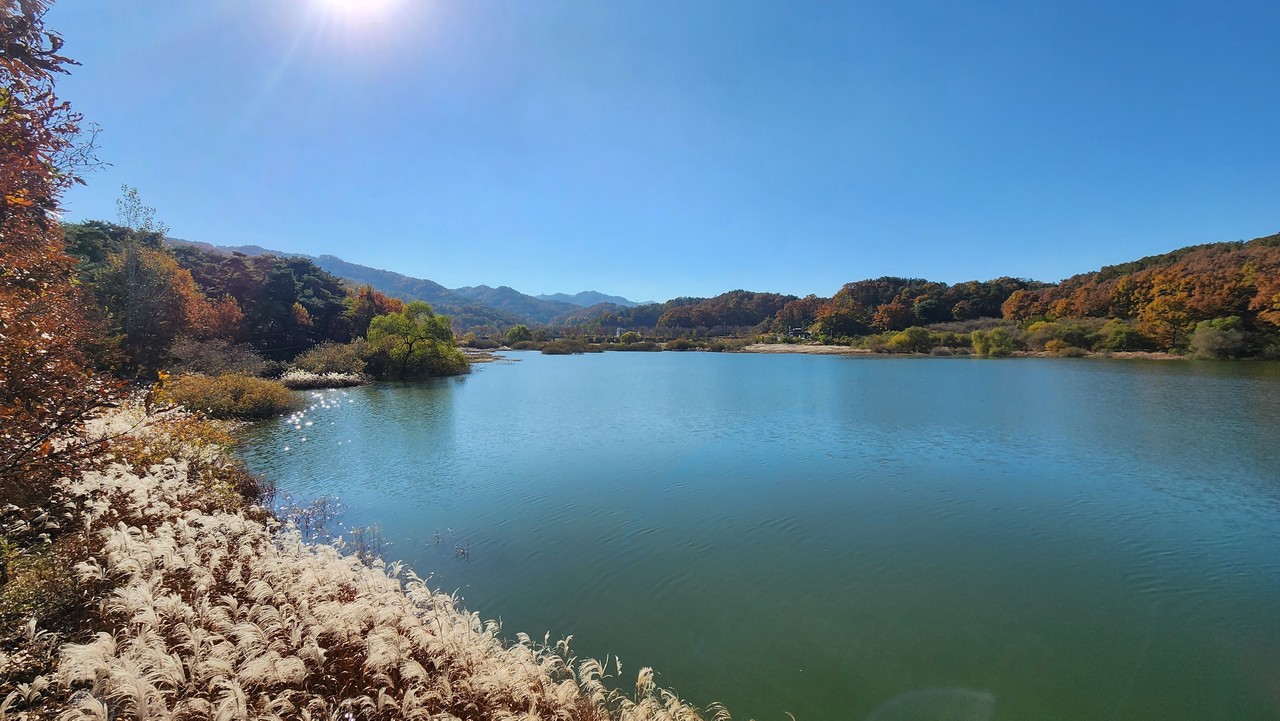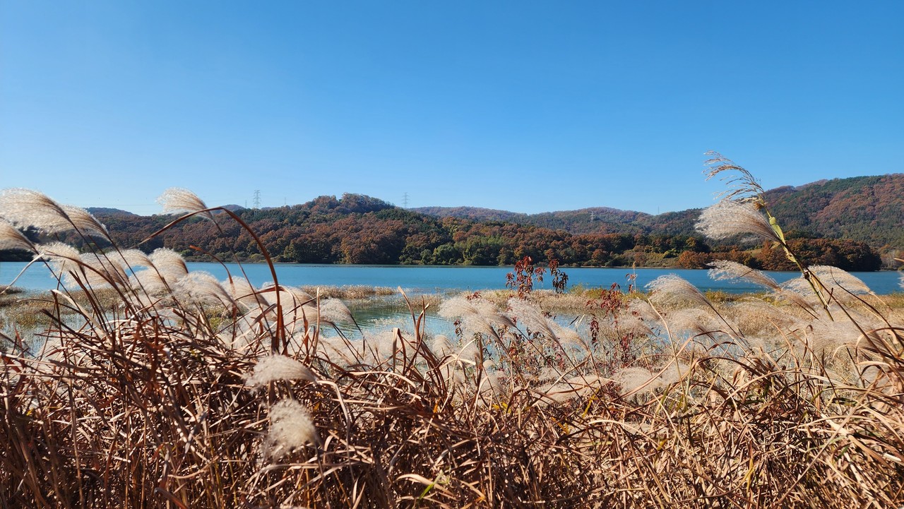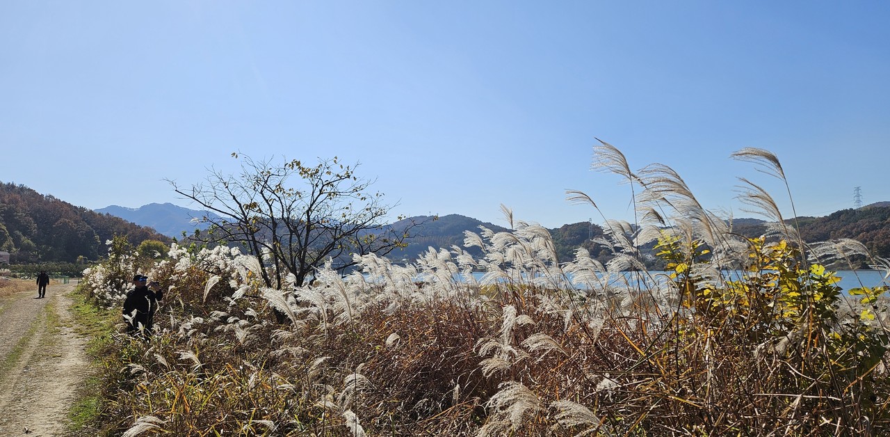 단풍이 절정을 이룬 지난 주말, 대청호오백리길에 또다시 발걸음을 내디뎠다. 이번엔 어디로 가볼까? 이 질문엔 망설임은 없었고 주저할 틈도 없었다. 가을이 무르익어가는 만추(晩秋), 힐링을 위한 선택이라면 물어볼 것도 없이 오백리길 5구간, 흥진마을길이다. 10년의 오백리길 경험에서 자연스럽게 ‘가을엔 흥진마을길이지’라면서 몸이 먼저 반응한다. 이례적인 가뭄에 담수된 물이 크게 줄면서 대청호반의 지형까지 바뀌었던 2015년의 기억이 뇌리에 뚜렷하게 박힌 탓이다. 그해 흥진마을은 예쁜 단풍에 새하얀 억새의 물결이 넘실대던, 입이 떡하니 벌어지는, 말 그대로 동화 속 풍경을 제대로 보여줬다. 그 황홀했던 순간을 잊을 수가 없다. 지금은 물이 꽉 들어차 그때의 운치와는 비할 바가 아니지만 그래도 명불허전, 따사로운 햇빛, 시원한 바람에 반짝이는 새하연 억새의 향연 가득한 흥진마을길은 여전히 가을 대청호의 진리다.