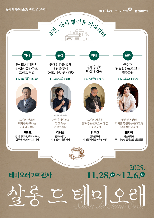 4회차 모두 송복섭 한밭대학교 교수가 진행자로 나서 근대건축에 대한 다양한 시민들의 이야기를 엮어 갈 예정이다. 테미오래 홈페이지와 SNS 계정을 통해 참가 신청을 할 수 있다.