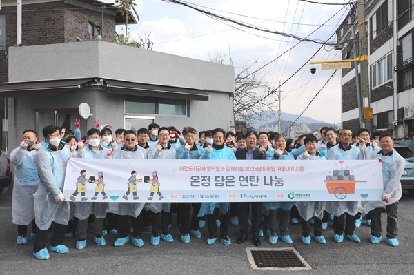 20일 대전도시공사 임직원이 정다운어르신복지관을 찾아 혹한기 지원과 봉사활동을 진행하고 기념촬영을 하고 있다. 이날 임직원들은 한파에 취약한 가정을 돕기 위해 연탄 3100장을 기부하고 직접 각 가정에 전달했다. 또 낙상사고를 예방하기 위해 지팡이·신발용 아이젠 각 100개, 핫팩 50개를 지원하고 118개 가정에 김장 김치를 제공하는 등 약 700만 원 상당의 물품을 전달했다.