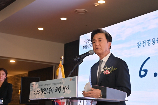 김태흠 충남지사가 20일 홍성 리첸시아컨벤션에서 열린 ‘6·25 참전유공자 위안행사’에서 참전유공자의 숭고한 희생과 헌신에 깊은 감사의 뜻을 전하고 있다. 김 지사는 “참전용사의 고귀한 애국심을 역사의 거울로 삼아 항시 가슴에 되새기고 최고의 예우와 의전을 다해 보답해야 한다고 믿고 있다. 충남은 자유와 평화, 번영의 대한민국을 세우고 뒷세대에게 물려주신 참전유공자들을 더욱 절실한 마음으로 섬기겠다”라고 말했다.