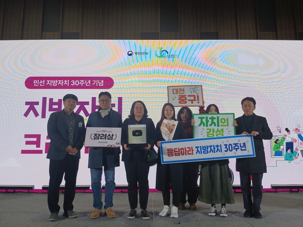 대전 중구가 울산전시컨벤션센터에서 열린 ‘지방자치 30주년 기념 크리에이터 경진대회’ 본선에서 장려상을 받았다. 23일 구에 따르면 경진대회는 행정안전부가 전국 지방자치단체를 대상으로 각 지역의 자치 성과와 의미를 공유·확산하기 위해 ‘응답하라 지방자치 30주년’을 주제로 개최했다. 구는 타임슬립 형식의 영상을 제작, 주민자치가 일상에서 어떻게 변화해 왔는지 사례 중심으로 설명하며 현장 평가단과 전문가 심사단의 긍정적인 평가를 받아 입선했다.