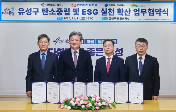 대전 유성구가 탄소중립 확산에 앞장선다. 구는 지난 21일 구청 중회의실에서 한전원자력연료, 한국가스기술공사, 국립대전숲체원과 탄소중립·ESG 실천 확산을 위한 업무 협약을 체결했다. 협약에 따라 참여 기관은 탄소중립포인트제 참여·홍보, 다회용기 사용, 탈(脫) 플라스틱, 관련 사업을 위한 행정·재정 협력, 기후취약계층 지원, 환경 정책 참여 확대 등을 추진한다.