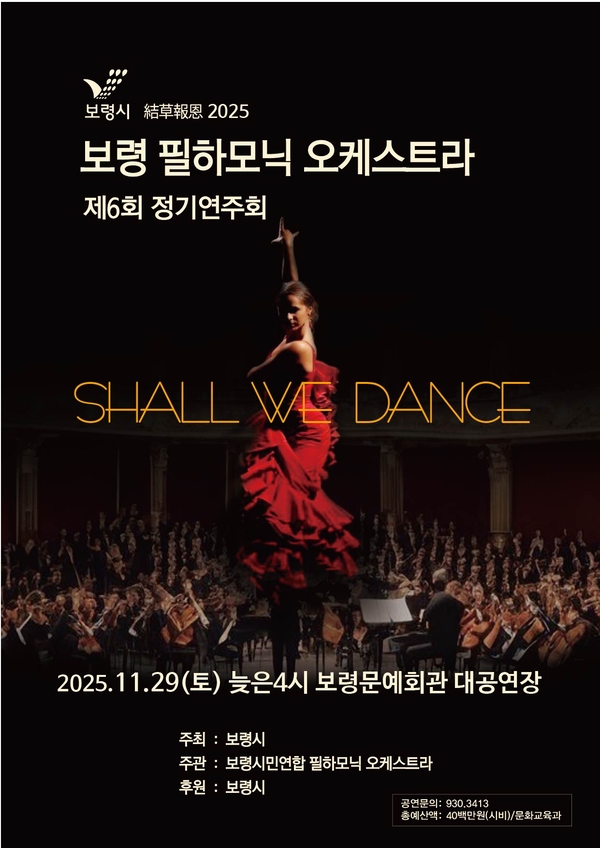 보령시민연합 필하모닉 오케스트라(단장 윤영미)가 오는 29일 오후 4시, 보령문화예술회관 대공연장에서 제6회 정기연주회 ‘쉘 위 댄스(Shall We Dance)’를 개최해 시민들에게 특별한 음악적 감동을 선사한다.