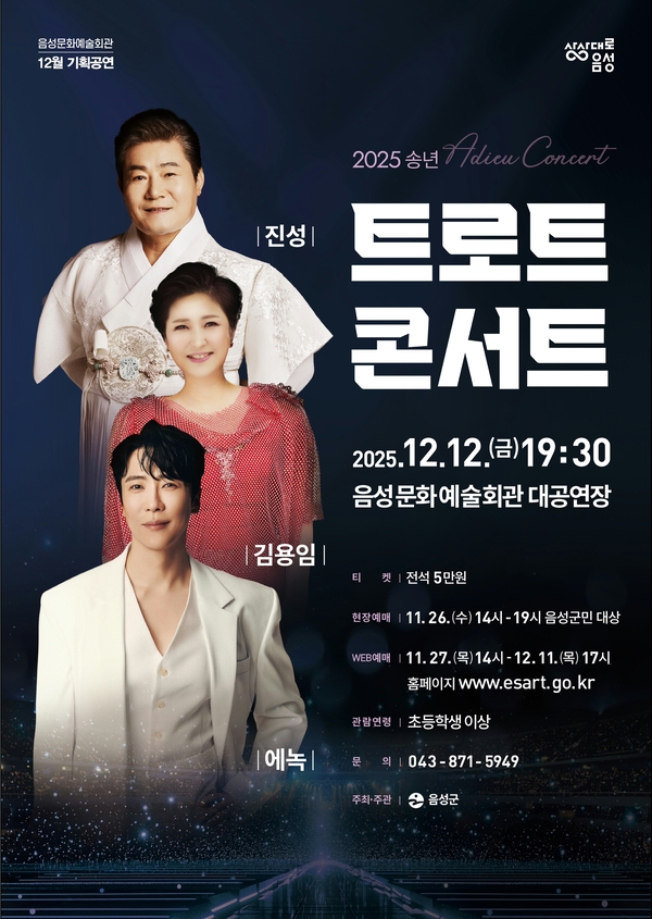 ‘2025 송년 트로트 콘서트’는 초등학생 이상 관람이 가능하다. 티켓은 전석 5만원으로 11월 26일 14시부터 음성군민 대상의 현장 예매 후 27일 14시부터 음성문화예술회관 누리집(www.esart.go.kr)에서 1인 4매까지 예매 가능하다.