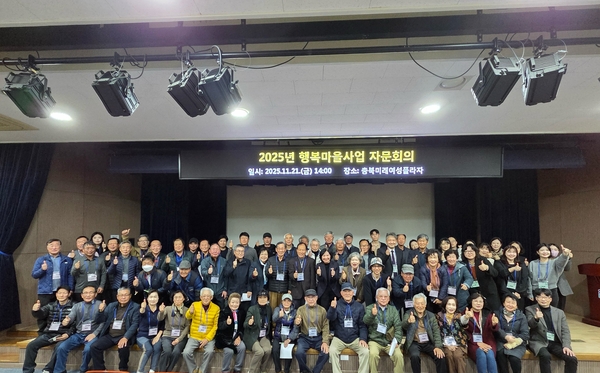 충북도는 11월 21일 충청북도 미래여성플라자에서 행복마을사업 22개 마을별 리더와 도‧시군 마을사업 담당자, 중간지원조직 등 90여 명이 참석한 가운데 ‘2025년도 행복마을사업 자문회의’를 개최했다.
