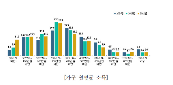 조사에 따르면, 가구 월평균 소득은 ‘300만~400만 원 미만’(19.5%)이 가장 높은 비중을 보였다.