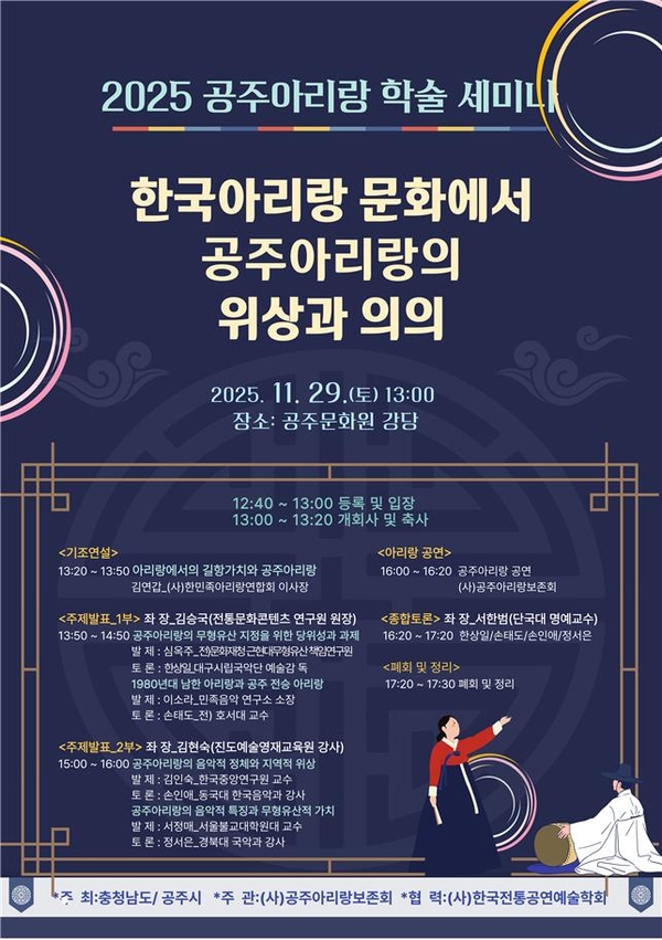 충남도와 공주시가 주최하고 (사)공주아리랑보존회가 주관하는 ‘2025 공주아리랑 학술세미나’가 오는 29일 오후 1시부터 공주문화원 강당에서 개최된다.