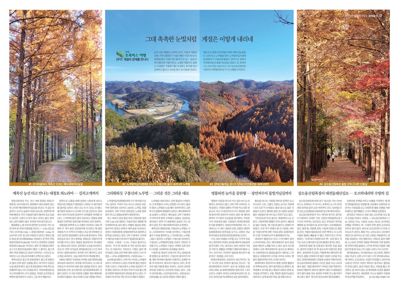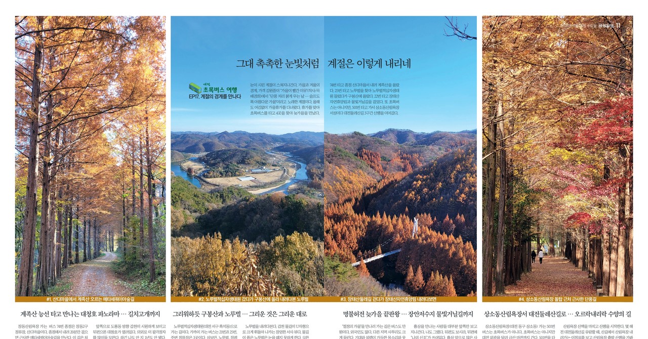 눈이 시린 계절이 스쳐지나간다. 가을과 겨울의 경계, 가객 김원중이 ‘가을이 빨간 이유’(작사/곡 배경희)에서 ‘단풍 저리 붉게 우는 날 … 슬프도록 아름다운 가을’이라고 노래한 계절이다. 올해도 어김없이 가을휴가를 다녀왔다. 휴가를 맞아 초록버스를 타고 4곳을 찾아 늦가을을 만났다. 74번 타고 종점 산디마을서 내려 계족산을 올랐다. 25번 타고 노루벌을 찾아 노루벌적십자생태원 들렀다가 구봉산에 올랐다. 22번 타고 장태산자연휴양림과 물빛거닐길을 걸었다. 또 초록버스는 아니지만, 501번 타고 가서 상소동산림욕장 서성이다 대전둘레산길 3구간 산행을 이어갔다.
