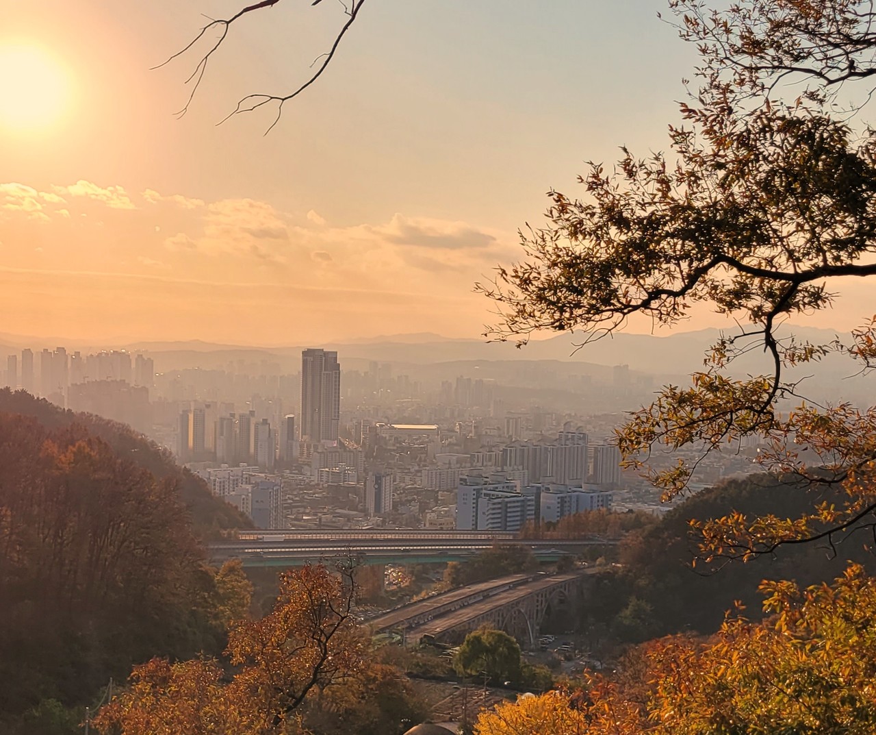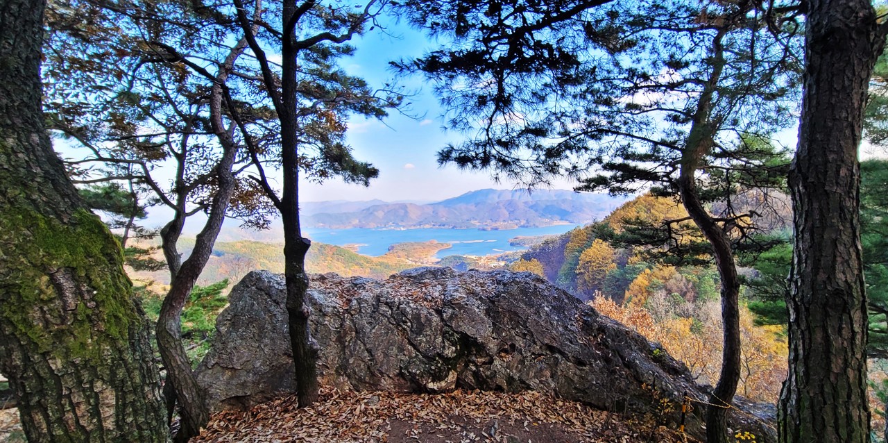 계족산성과 절고개 갈림길에서 절고개 방향으로 틀어 산책 같은 산행을 한다. 여기저기 단풍은 눈을 즐겁게 한다. 절고개 갈림길에서 추동 쪽으로 진행하지 않고 다시 산길을 탄다. 가양비래공원/길치고개 방향이다. 다시 갈림길, 가파른 오르막을 선택하면 팔각정자가 나온다. 그곳 뷰가 예술이다. 앞쪽으로 도룡동 방향 갑천이 시원하게 보이고뒤편으론 대청호가 열려있다. 의외로 이 팔각정자를 많이들 모른다. 하긴 나도 안 지 1년도 안 됐다. 팔각정자 뷰보다 더 근사한 건 다음 포인트다. 정자에서 내려가다보면 호연지기 파워풀한 바위를 만난다. 그 바위에 올라 앉아 감상하는 대청호 방향 풍경은 진취적인 감탄사를 자아낸다. 맘이 동한다.