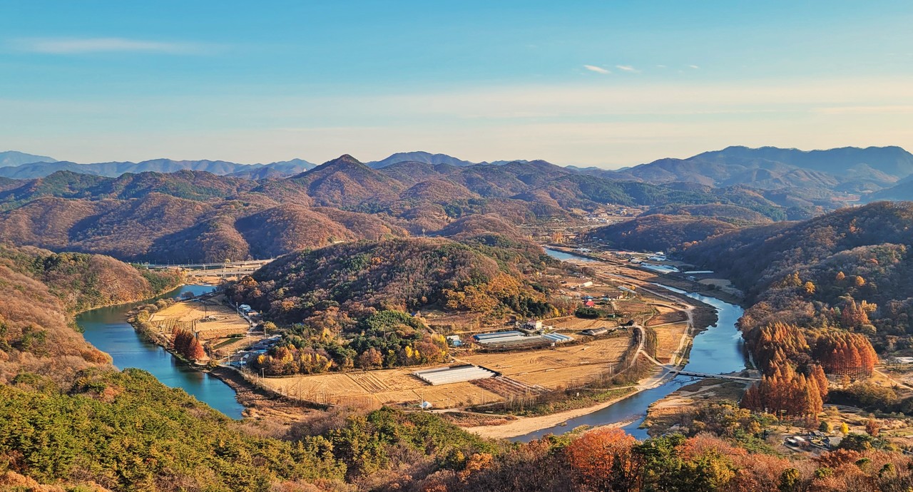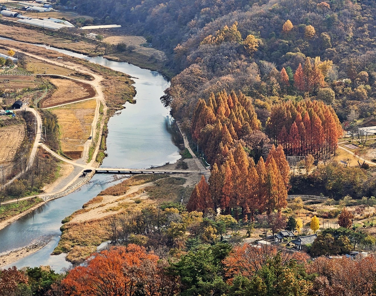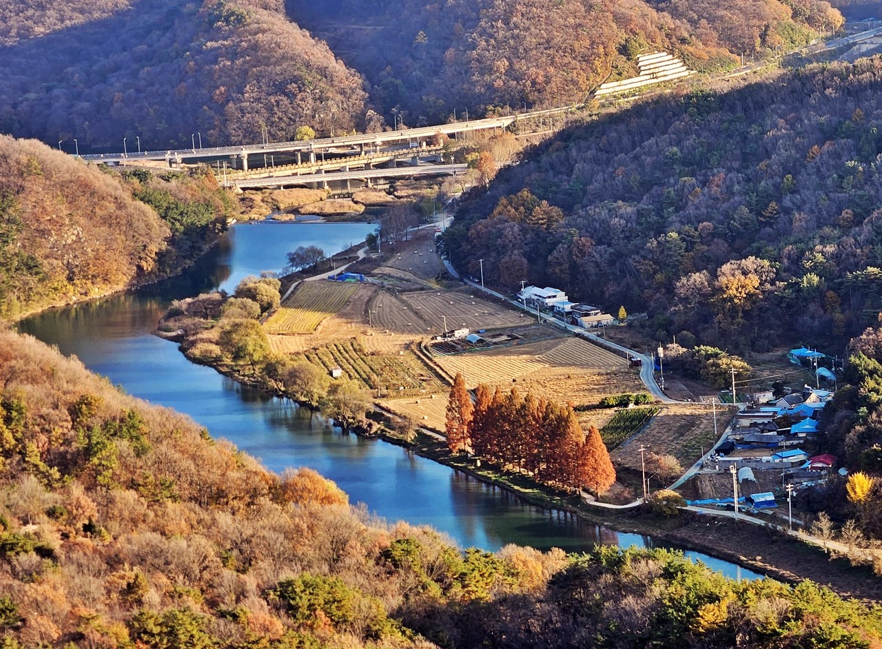노루벌을 내려다본다. 갑천 물길이 U자형으로 크게 휘돌아 나가는 장엄한 서사 뷰다. 물길이 품은 노루벌은 눈을 떼지 못하게 한다. 오른쪽 3시 방향에 생태원이 보인다. 메타세쿼이아숲 숨결이 느껴진다. 메타숲과 고택 구봉재사가 어우러져 한폭 수묵화다. 장평보, 상보안도 짚어본다. 왼쪽 7시 방향에선 상보안 가는 길 휴식 같은 친구 메타세쿼이아길이 손짓한다.