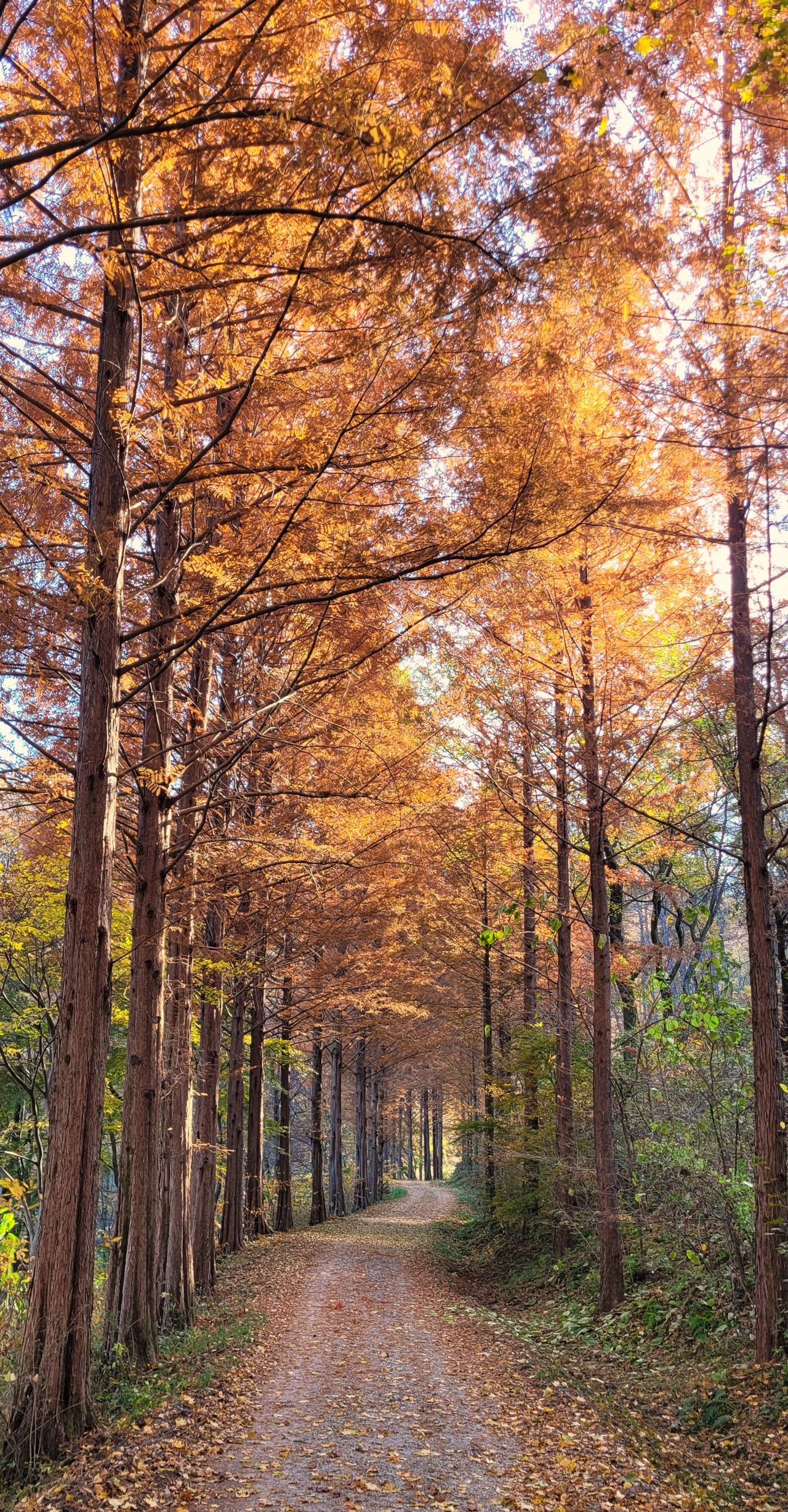 장동산림욕장 가는 버스 74번 종점은 장동2구 정류장. 산디마을이다. 종점에서 내려 20분만 걸으면 근사한 메타세쿼이아숲길을 만난다. 이 길은 처음이다. 눈부신 숲길이 마중나오는데, 로맨틱한 매력에 빠진다. 이미 가을잎이 많이 떨어져 조금 늦었다 싶지만 그래서 더 운치 있다. 아무도 없다. 혼자 걷는 길은 외롭지 않다. 부유한 자부심이 돋는다.